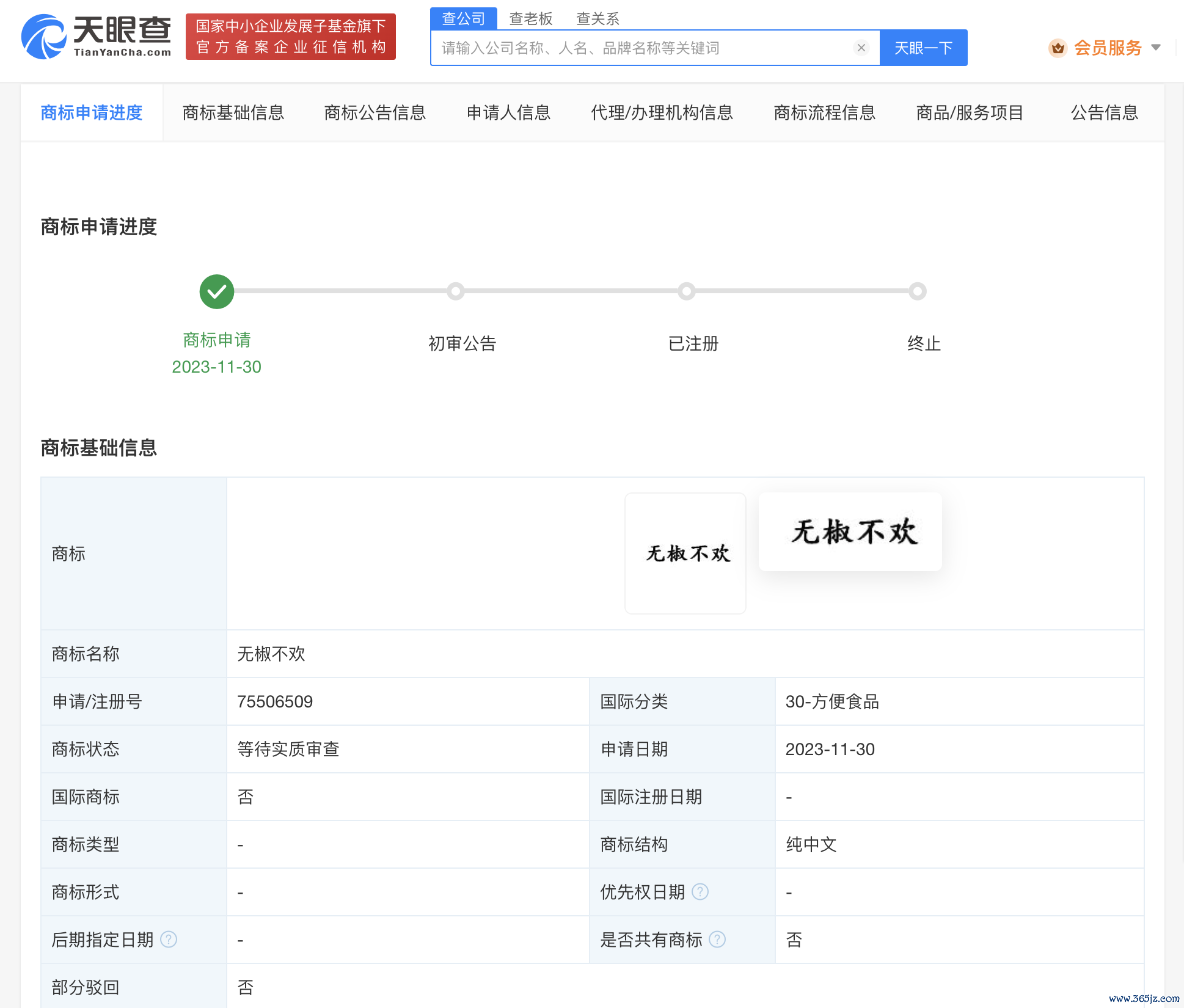 天眼查App清爽,近日,一米八食物科技(浙江)有限公司央求注册一枚“无椒不欢”商标,外洋分类为便捷食物,现时商标情状为恭候本色审查。