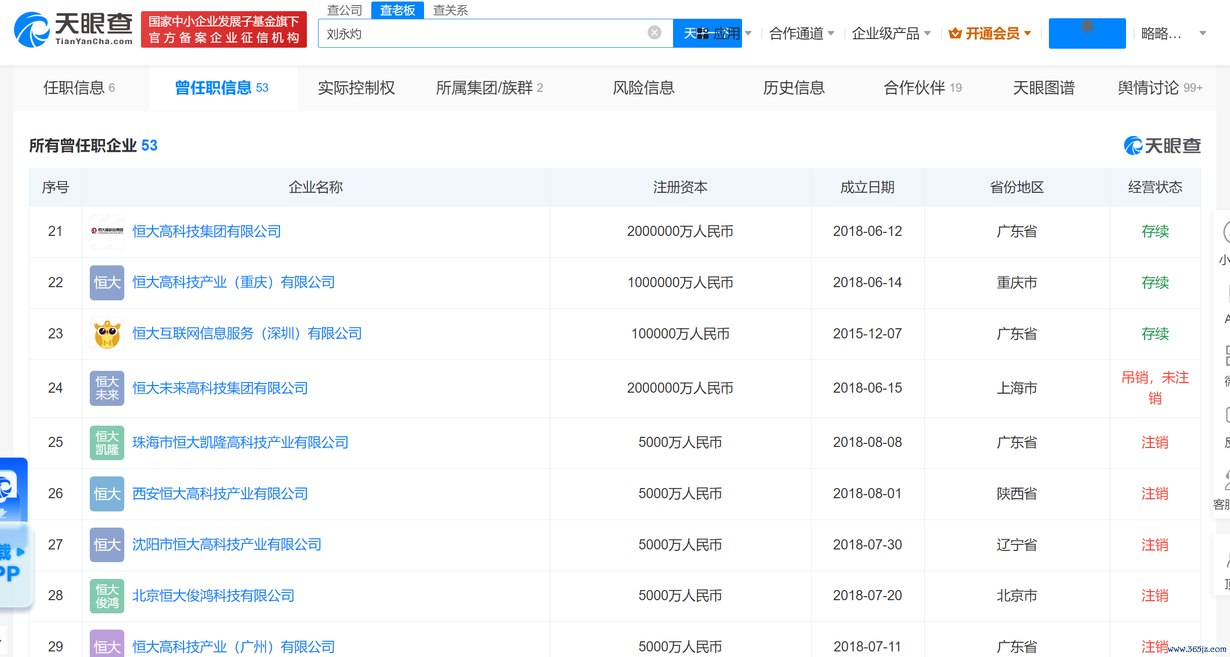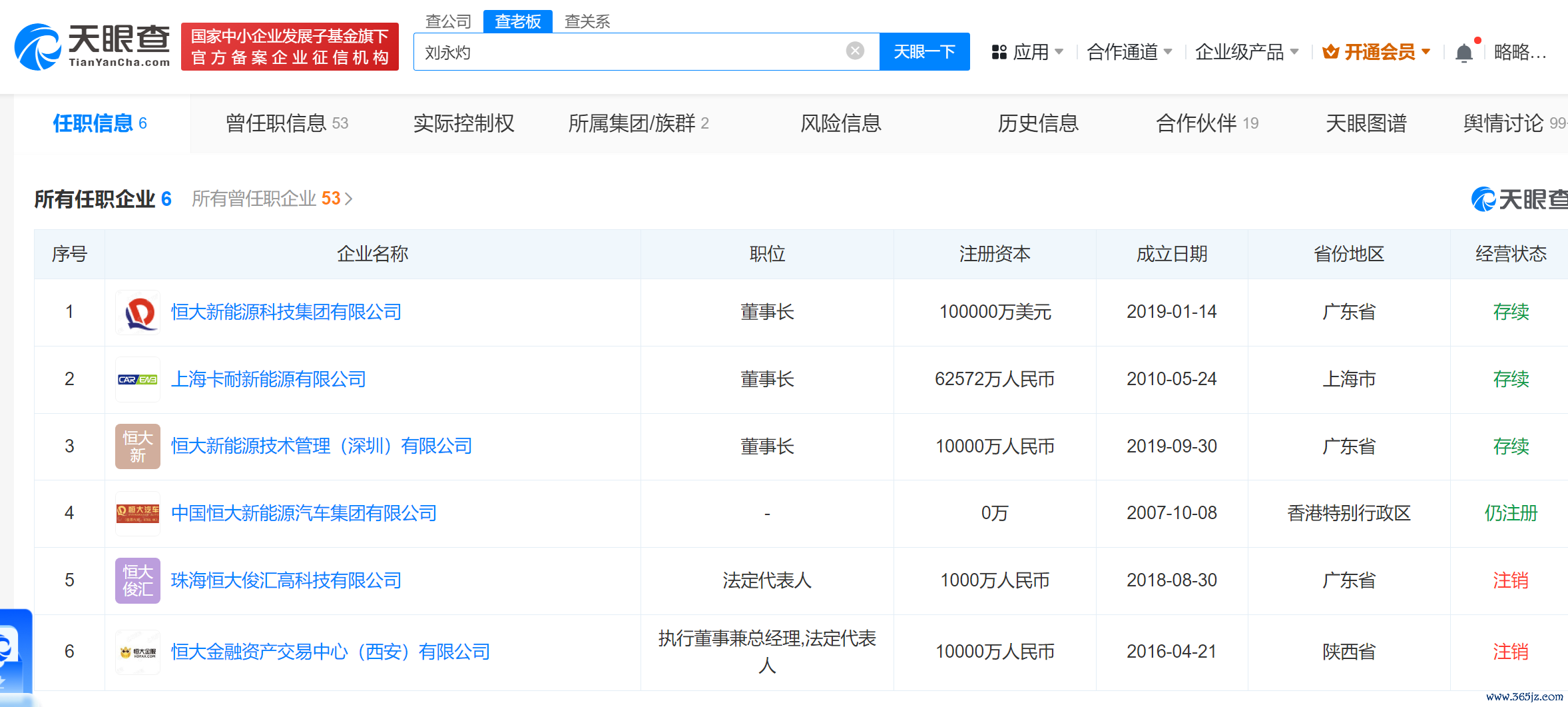 天眼查App显现,刘永灼名下有关6家企业,除中国恒大新动力汽车集团有限公司除外,还有3家为存续景象,区别为恒大新动力科技集团有限公司、上海卡耐新动力有限公司、恒大新动力技艺不停(深圳)有限公司,刘永灼在上述3家公司均担任董事长职务。