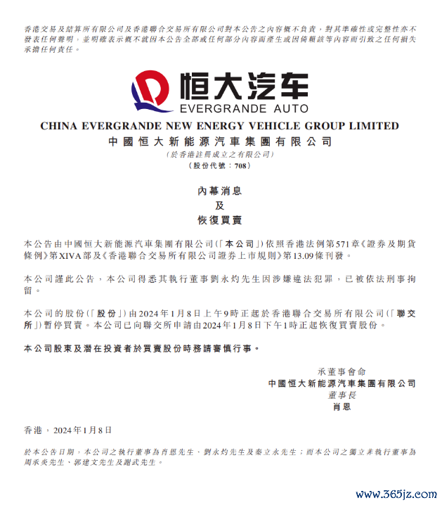 本公司得悉其执行董事刘永灼先生因涉嫌坐法作恶,已被照章刑事拘留。